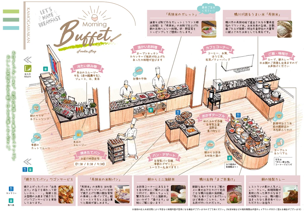 ビュッフェのお料理の配置図を、鴨川館のホームページからお借りしました。さまざまなお料理や飲み物が並んでおり、板前さんが目の前でお料理してくれるオープンキッチンもあります。