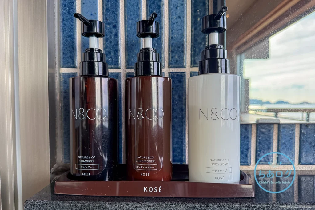 シャンプー・コンディショナー・ボディソープは、KOSEの「N&CO(ネイチャーアンドコー)」。植物由来の成分が配合された、宿泊施設向けに展開されているシリーズです。