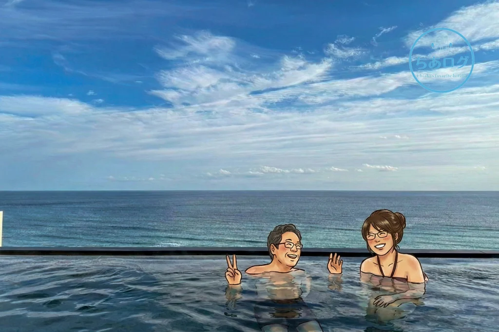 ここは、名前の通り「温泉」と「プール」が融合した新しい形のリラックス空間。 目の前に広がる太平洋と湯船が一体化して見えるインフィニティ設計になっており、空と海に溶け込むような絶景体験ができます。
