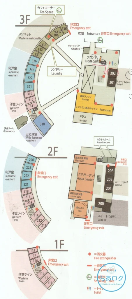 - 2Fのスイート(201, 202, 205):温泉大浴場や森のスパ、クアガーデン(プール)、カラオケルームが目と鼻の先。