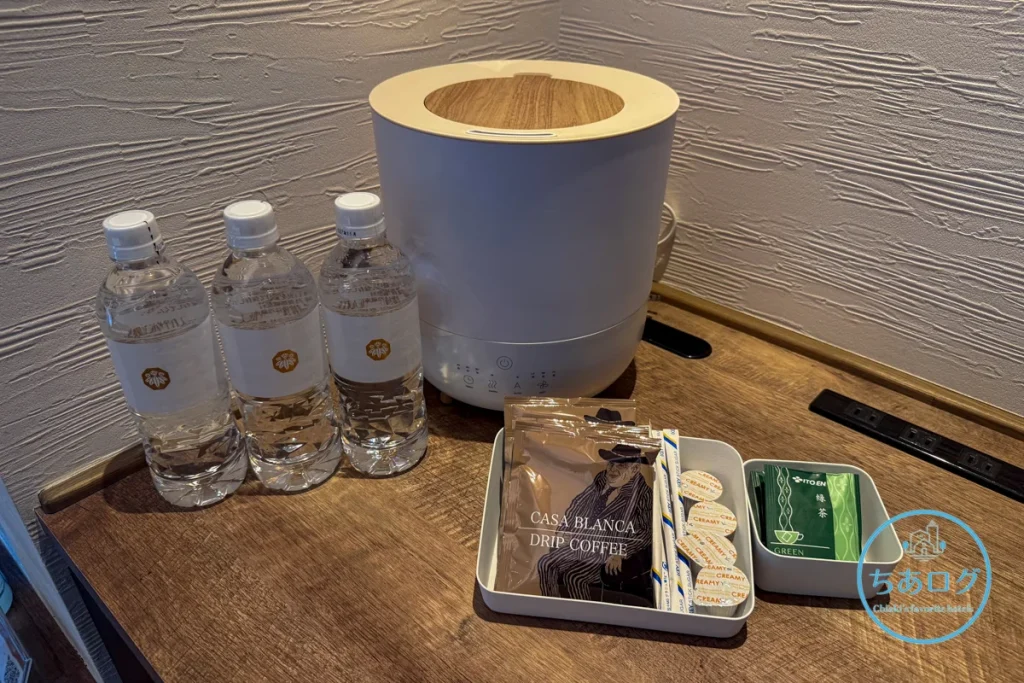 その代わり、お部屋には「CASA BLANCA」のドリップコーヒーや緑茶、金谷のロゴ入りミネラルウォーターが用意されています。