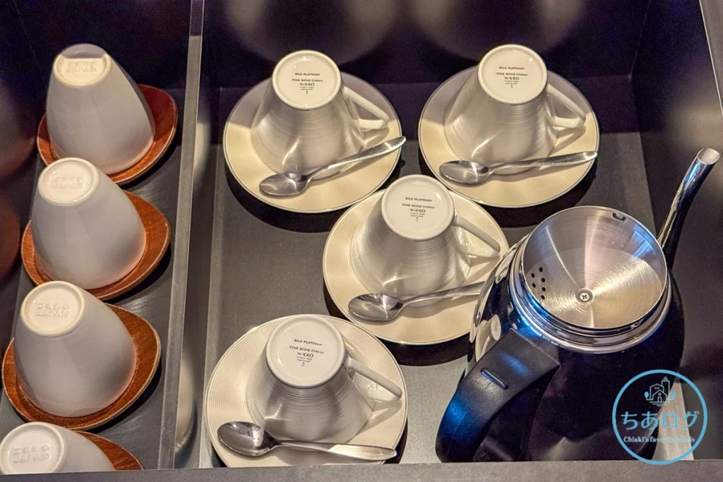 サイドボードの引き出しに用意されたカップ&ソーサーは、NIKKO(ニッコー)のファインボーンチャイナ。