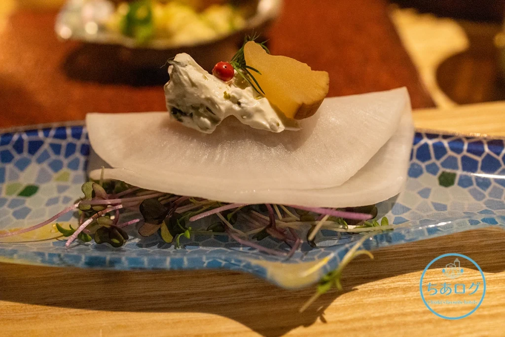 大根でブリを巻き、サワークリームやいぶりがっこ、ピンクペッパーを添えた創作ブリ大根