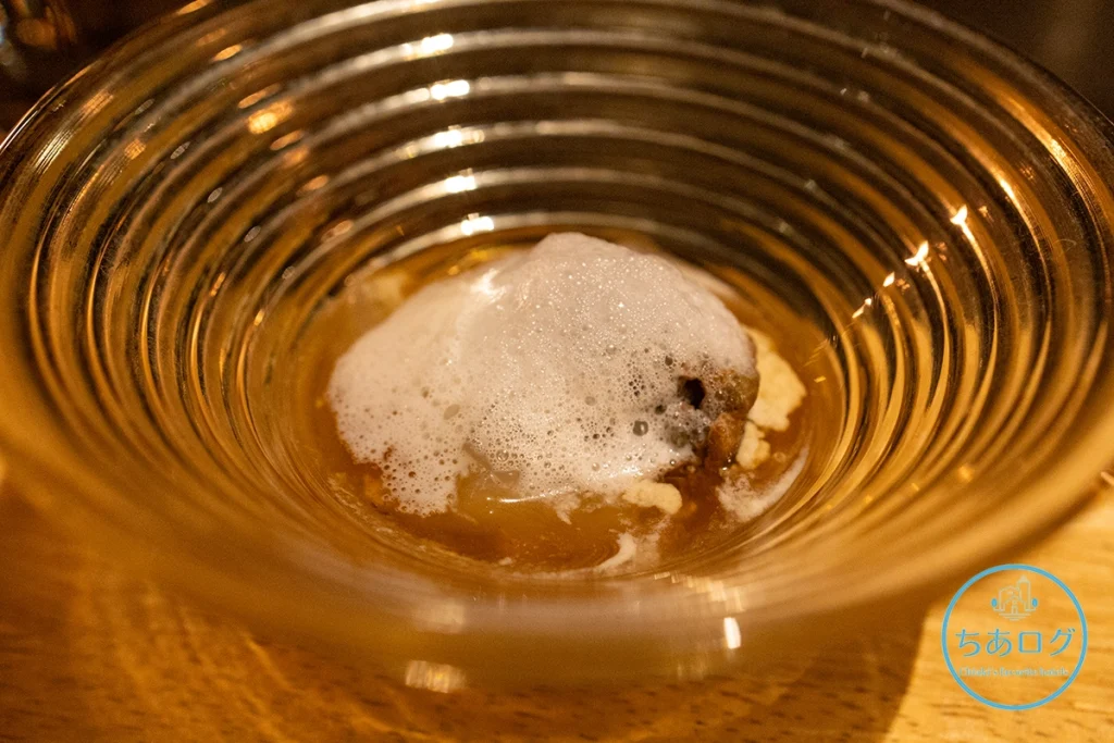 牡蠣のムースとジュレ、その上に牛乳と牡蠣の出汁を合わせた泡が乗っています
