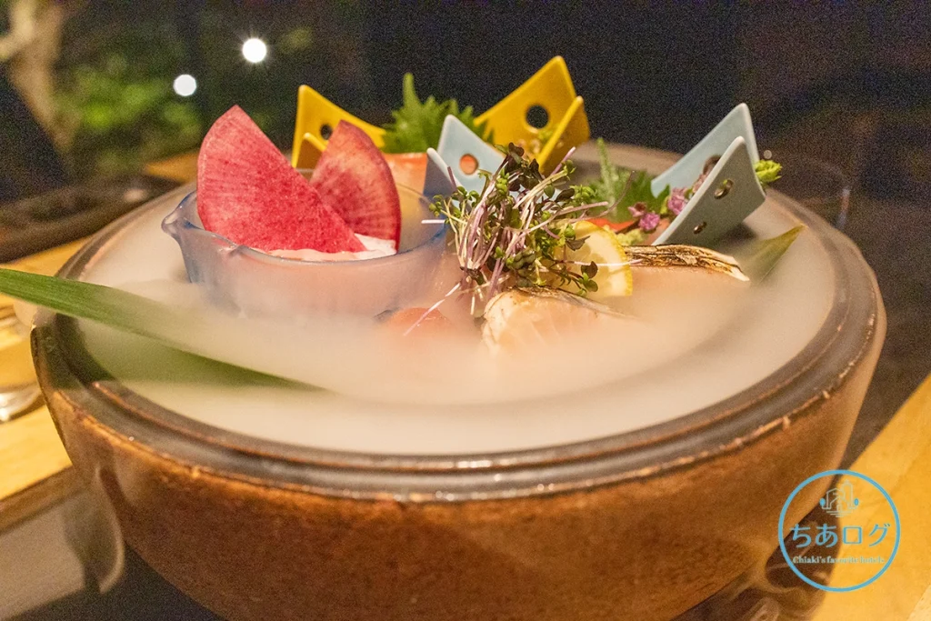 球体の器を開けると、スモークと共に現れるお刺身!
