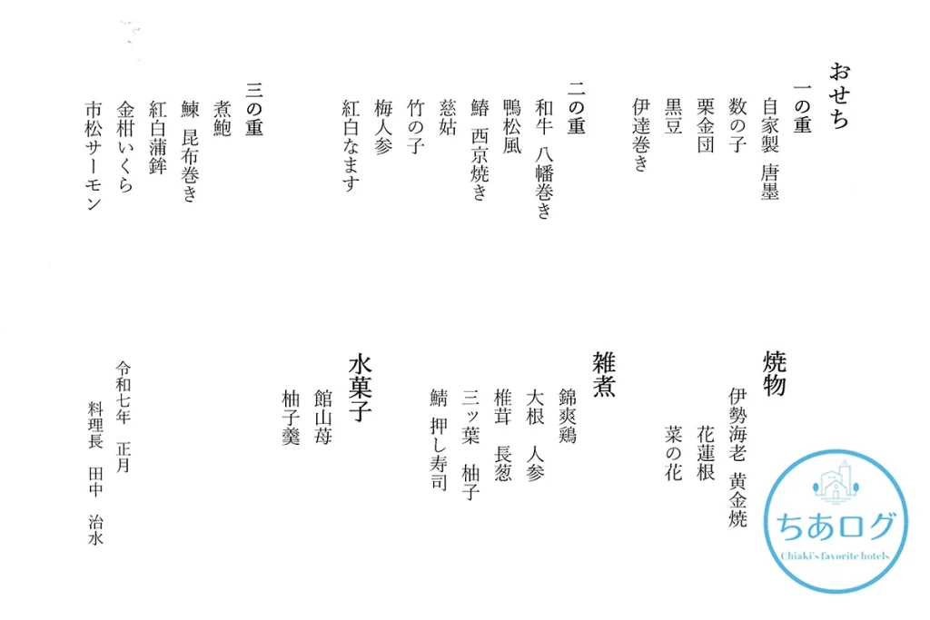 いつ訪れても期待を裏切らない、地元・館山の海の幸や旬の食材をふんだんに使った豪華なディナー。そして何より、お正月滞在ならではの華やかな「おせち料理」の朝食は、新しい年の幕開けにふさわしい特別な体験になりました。