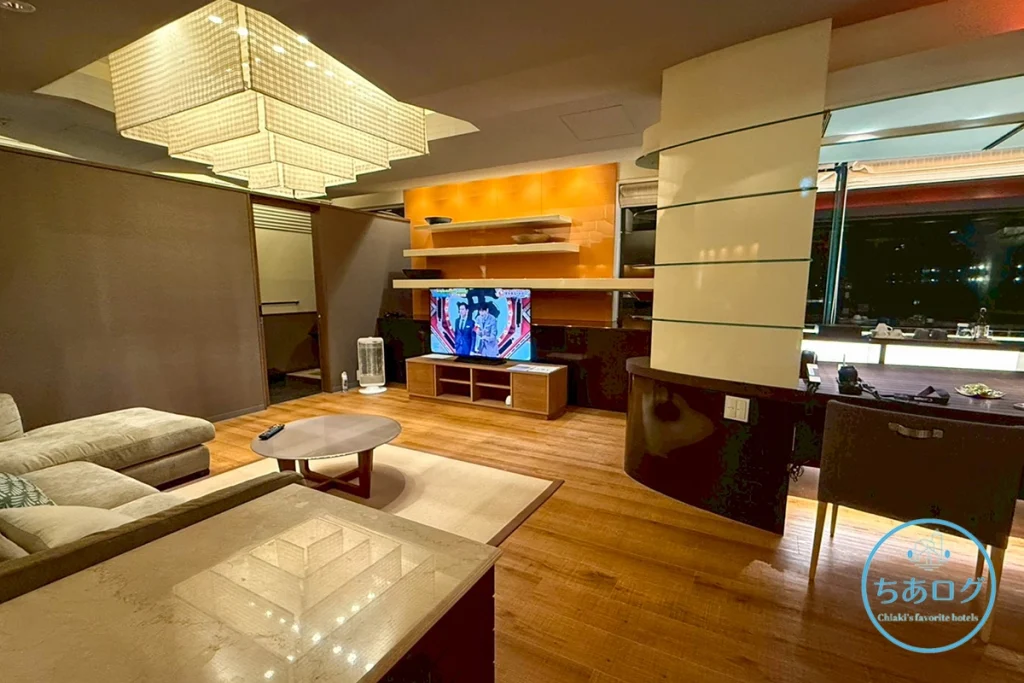 このオーシャンパノラマルームは、プレステージ棟ができる前はラウンジとして使われていた場所だそうです。かなりの広さがあり、他の客室とは趣が違います。