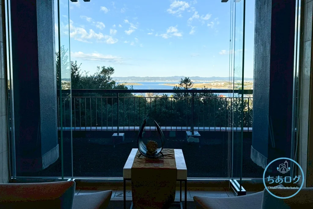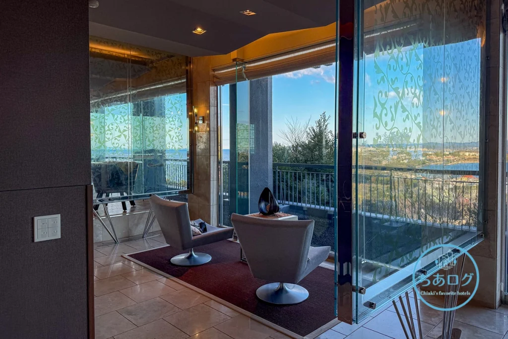 お部屋に入ってすぐのスペース。海に向かってテーブルと2脚の椅子が置かれています。