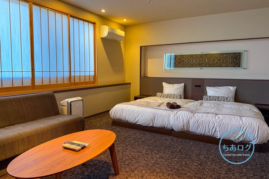 ドアで仕切られた独立したお部屋で、ツインベッド・ソファとテーブル・テレビ・冷蔵庫などが設えてあります。